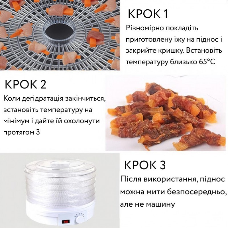 | Комплектація | Сушарка для фруктів, Прозора кришка, П’ять знімних пластикових піддонів, Інструкція, Упаковка |