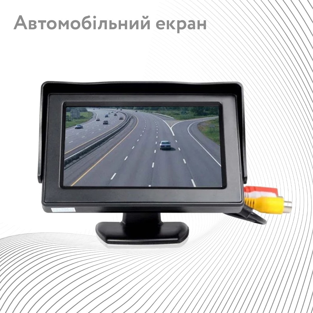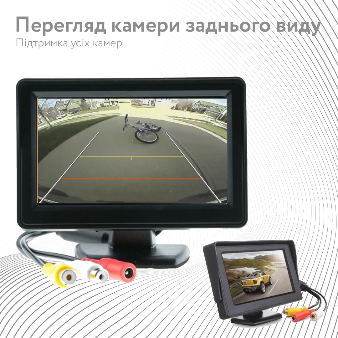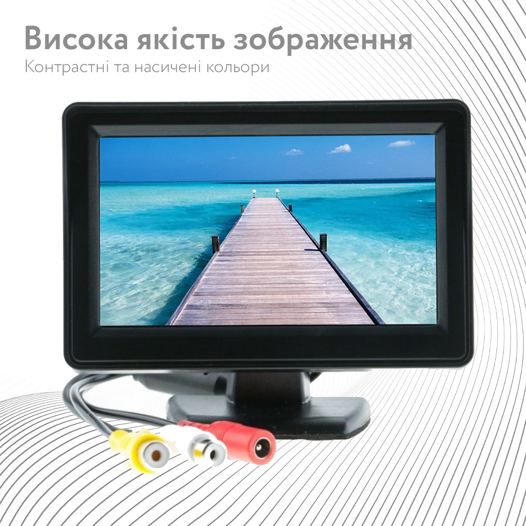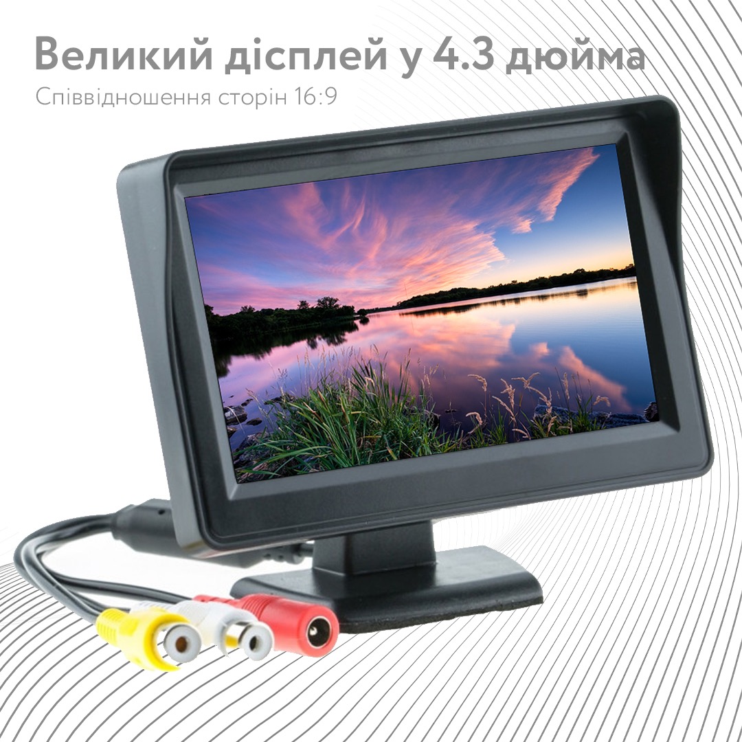 Монітор з розмірами екрану 4,3 дюйма для перегляду зображення з камери заднього виду автомобіля. Монітор встановлюється на передню панель автомобіля за допомогою 2-х стороннього скотча на нижньому боці опори. Опора і корпус монітора з'єднані шарнірно і можна встановити зручний для перегляду кут вертикального нахилу поверхні екрану. У комплект поставки входить рамка, яку можна надіти на корпус монітора і отримати захисний козирок над екраном.