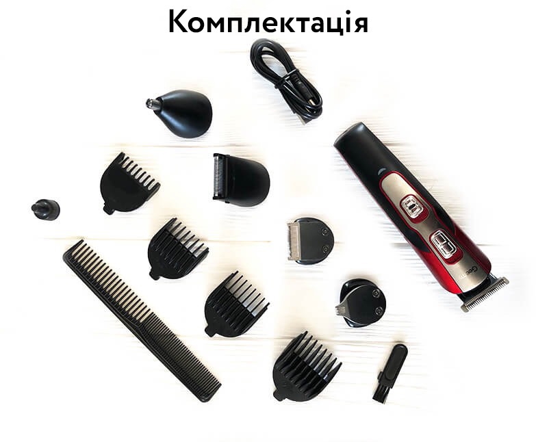 | Комплектація | Чотири насадки для стрижки (3 мм, 6 мм, 9 мм, 12 мм), Насадка триммер для носа та вух, Насадка триммер для бороди, Насадка бритва для бороди ,Кабель зарядки, Щітка для очищення, Підставка, Гребінець, Мастило |