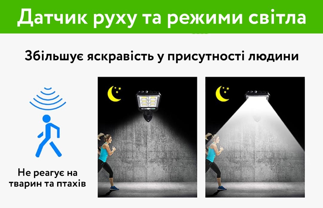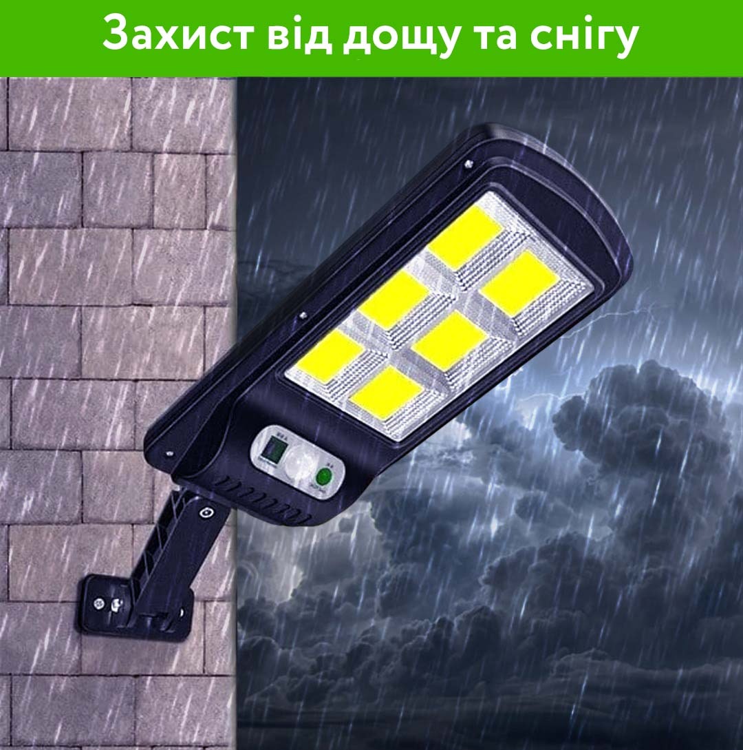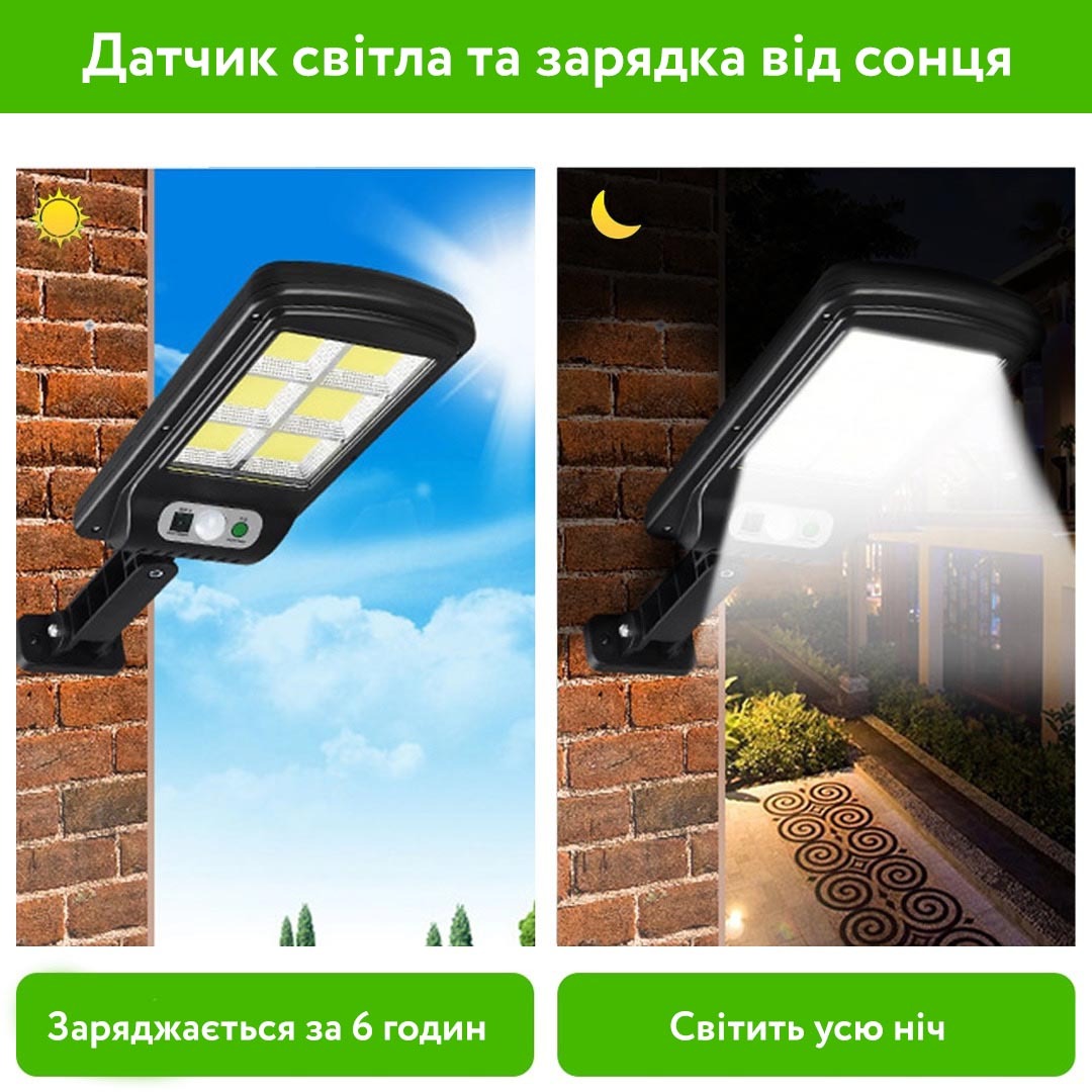 Вид: Вуличний ліхтар на сонячній батареї Датчик руху: Є Сонячна панель: Є Робоча напруга: 12 вольт Кількість світлодіодів: 6 СOB (120 шт) Кольорова температура: 6500K (біле світло, денне світло); Робоча температура: Від -25 ° C до + 75 ° C Водонепроникний: Ступінь захисту IP 65 Клас вологозахисту: IP65 Вбудований акумулятор: 2200 mah Світловий потік: 4400лм Дальність виявлення: від 7 до 9 метрів Режим работи: Повний, 50% потужності при неактивній роботі, 100% потужності у разі руху Комплектація: