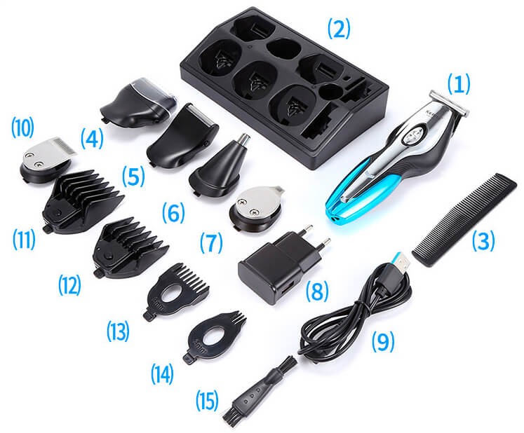 - Комплектація: Машинка, знімний тріммер для стрижки, 4 насадки, знімний триммер для носа і вух, знімний триммер для точного формування контурів, знімна сітка бритва, знімний триммер для тіла, зарядний пристрій + кабель, пензлик, підставка, інструкція.