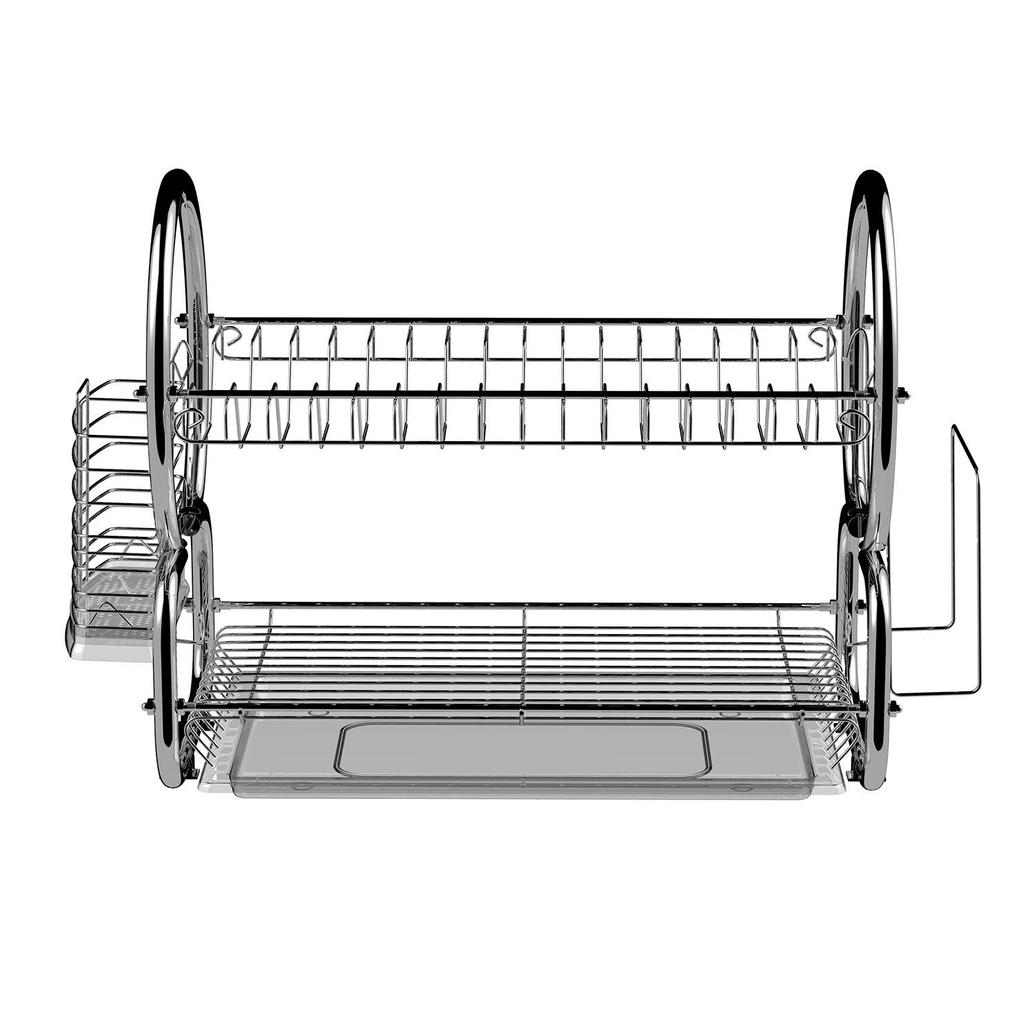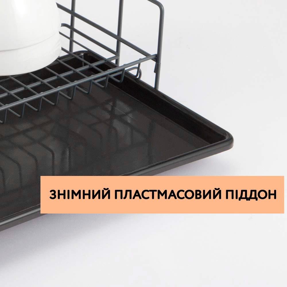 У сушарці є місця для тарілок, чашок, келихів, виделок та інших предметів. Вода з них стікає у пластиковий піддон, який дуже легко вийняти, щоб злити воду. Пластикові ніжки роблять конструкцію стійкою, перешкоджають ковзанню не дряпаючи поверхні.