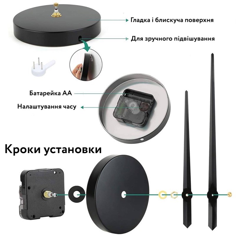 | Діаметр механізму на який кріпляться стрілки | 10 см, висота 2 см |