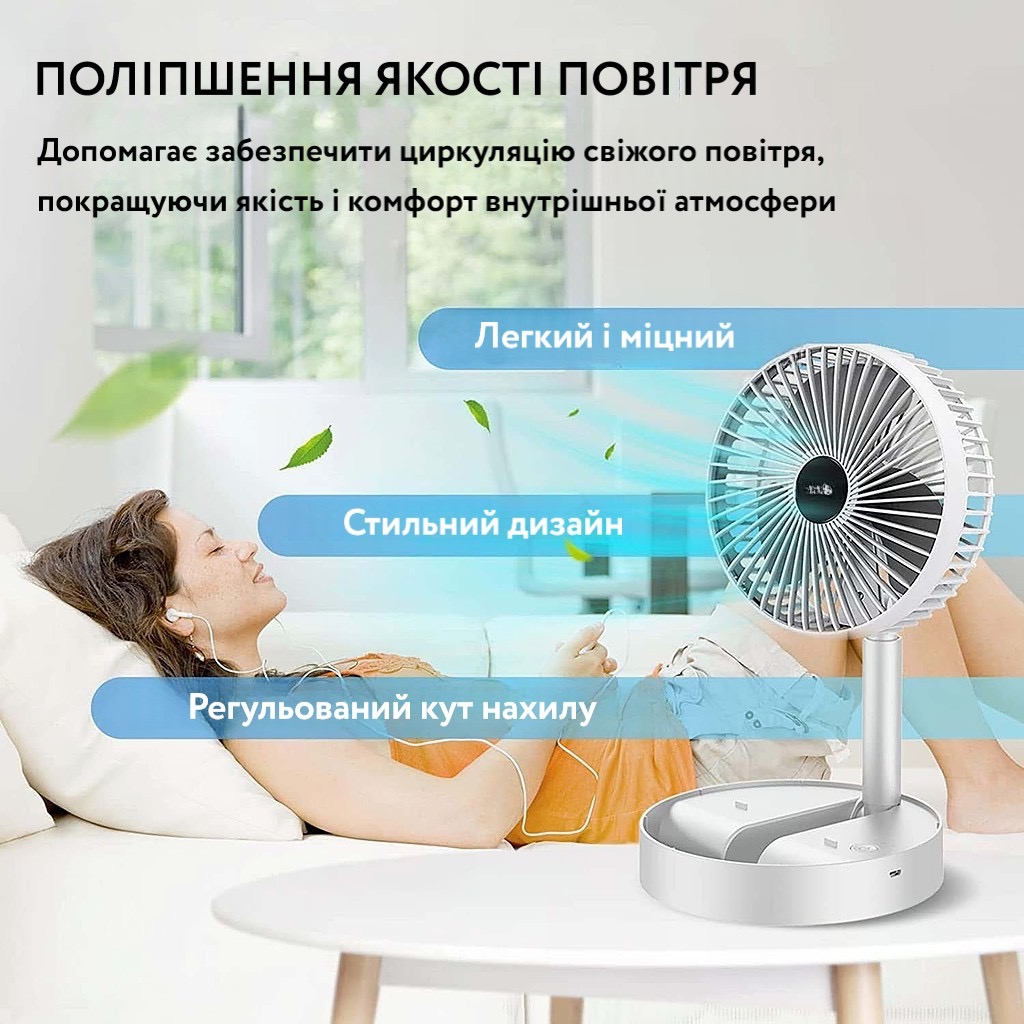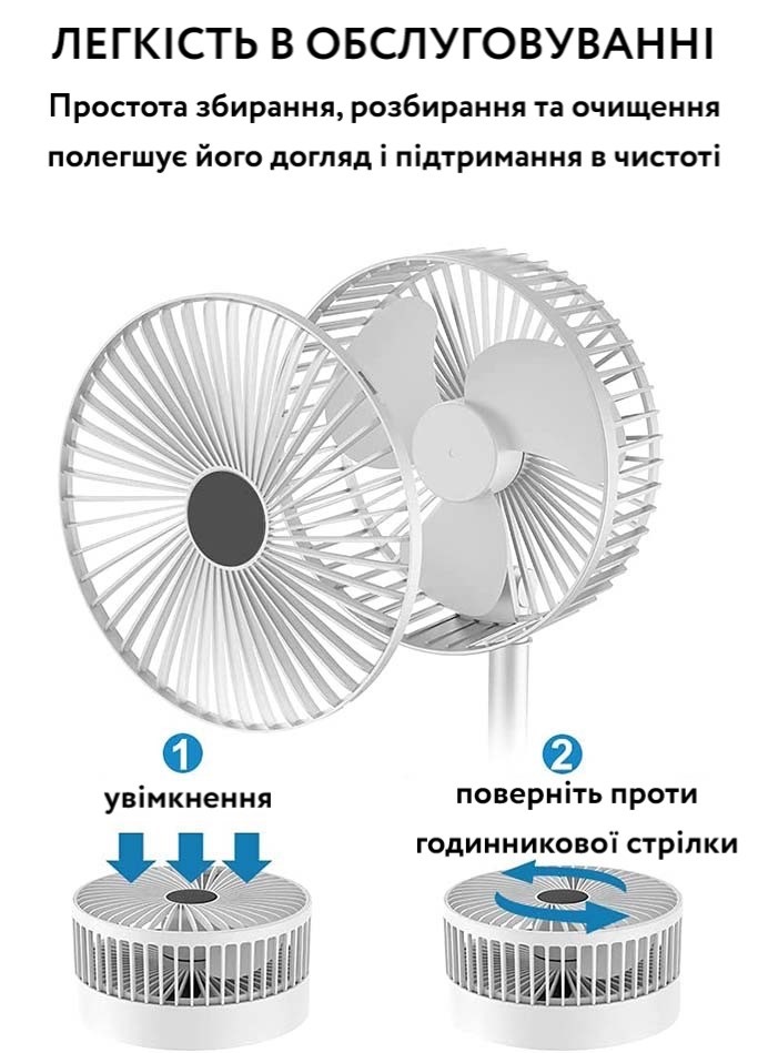 Складаний вентилятор - ідеальне рішення для всіх, хто шукає ефективне охолодження в будь-який час та в будь-якому місці. Цей портативний вентилятор дає зручність, потужні функції, які допоможуть вам залишатися прохолоді і комфорті навіть у найспекотніші дні
