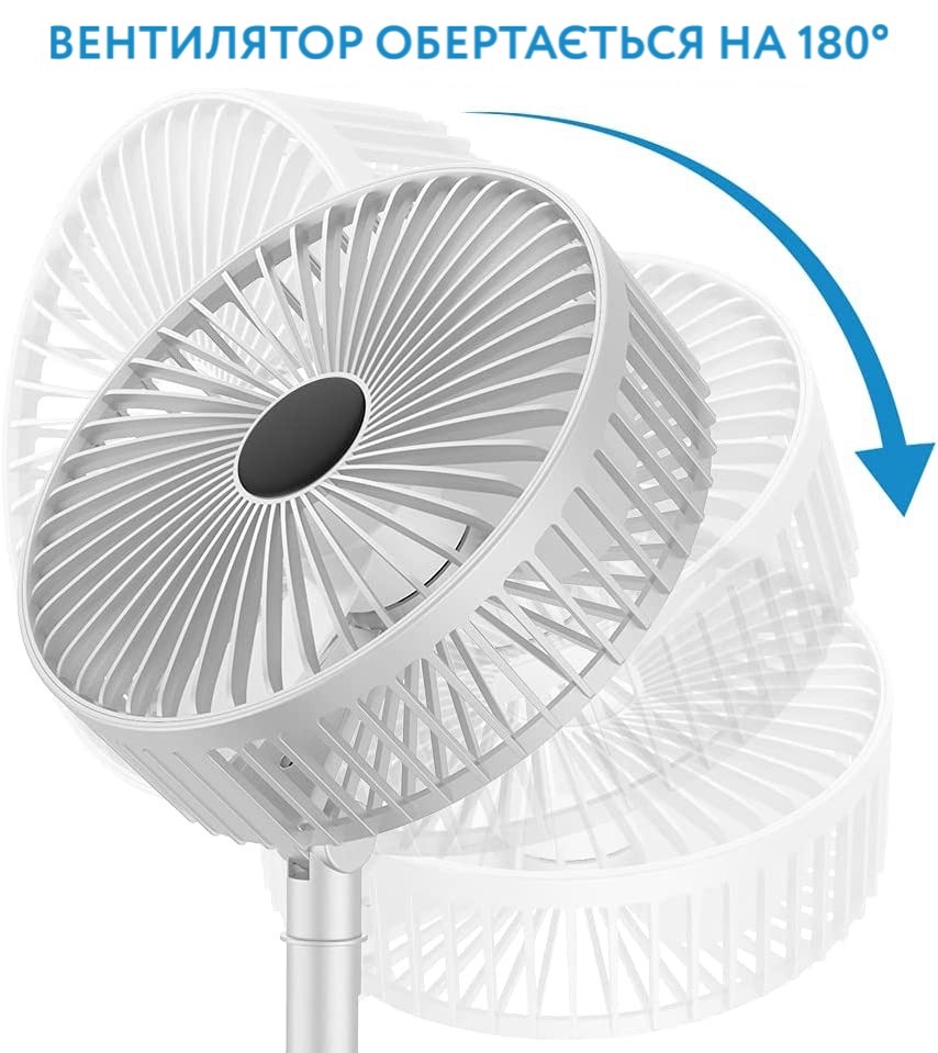 Вентилятор можна регулювати під кутом до 180°, а фіксований стрижень можна розтягувати вгору та вниз на 360 мм. Регульована швидкість вітру та безшумна робота - 3 рівні управління регулюванням швидкості вітру: вітер/м'який вітер/сильний вітер.