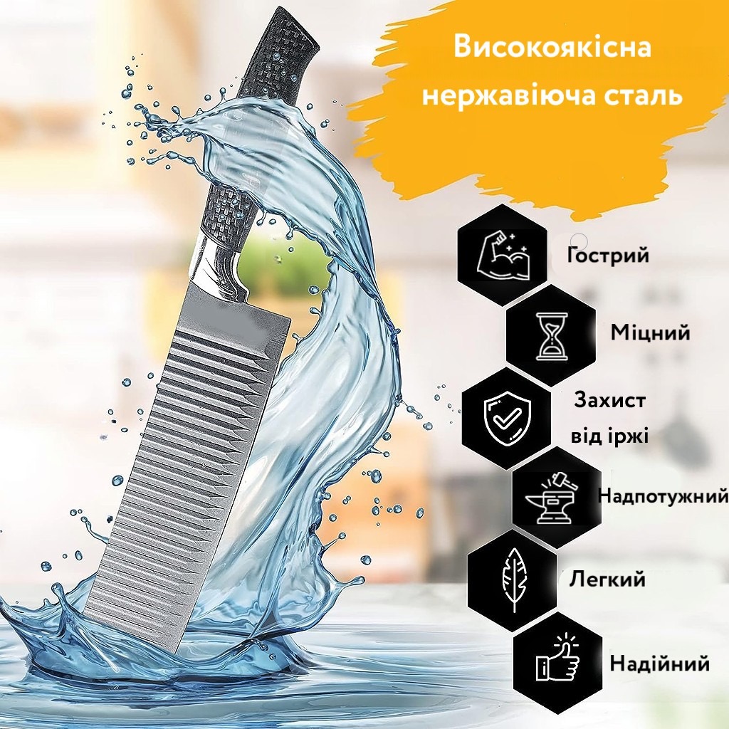 Набір ножів 6 в 1 виготовлений із якісної високоміцної та корозійностійкої сталі гарантує довгий термін служби. Ножі відрізняються високою зносостійкістю та легко заточуються.