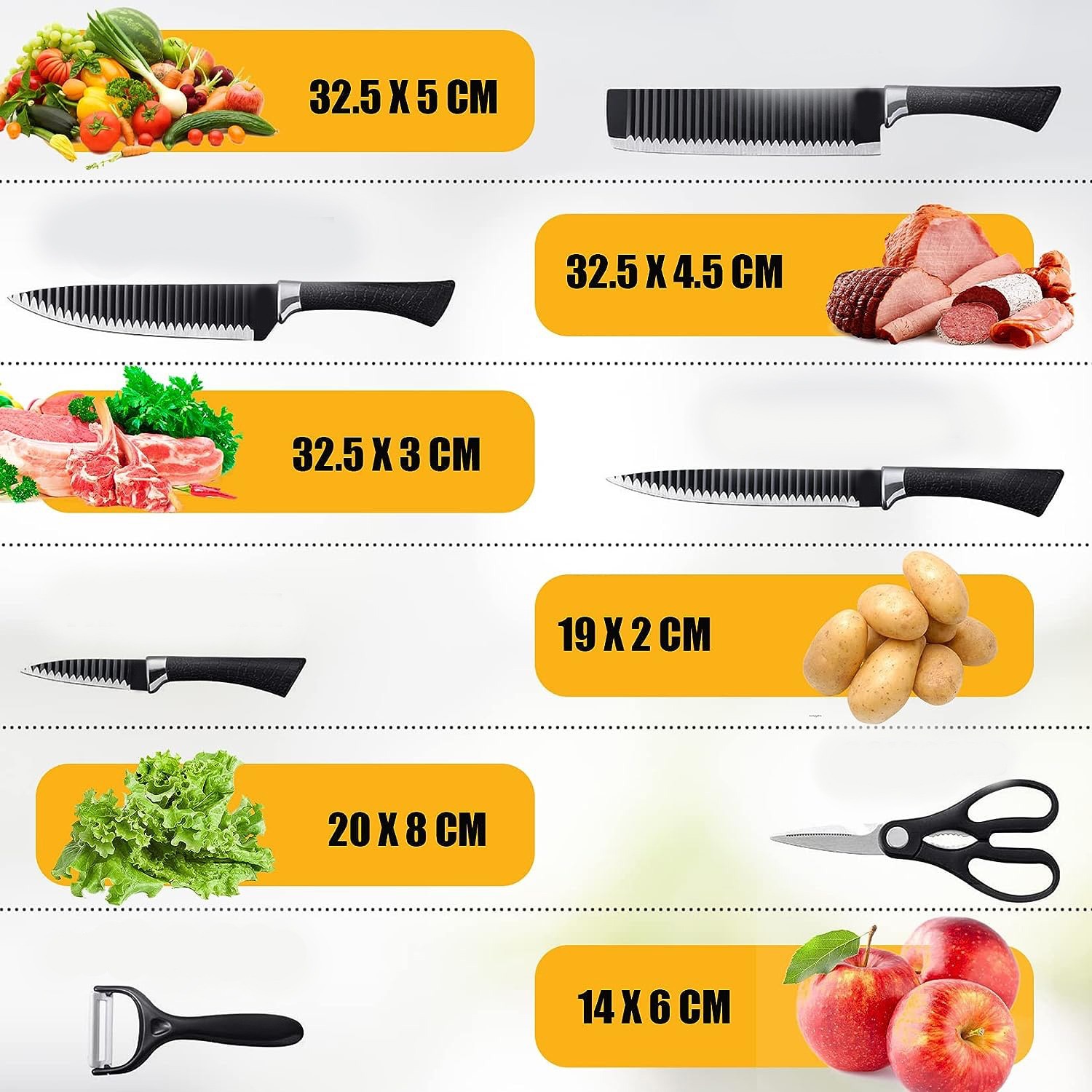 | Комплектація | Універсальний ніж (довжина леза 20 см), ніж для мʼяса (довжина леза 20 см), ніж для різання хліба (довжина леза 20 см), ножиці (довжина 13 см), ніж для (довжина леза 9 см), ніж для чищення шкірки, фірмова коробка |