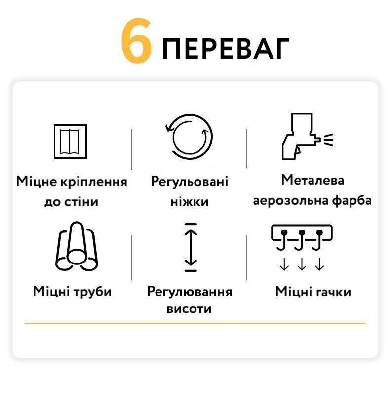 | Переваги | Оптимальне використання невеликого простору, комплектні тримачі для кріплення до стіни, регульовані підставки, згладжені не гострі кути, проста у збиранні |