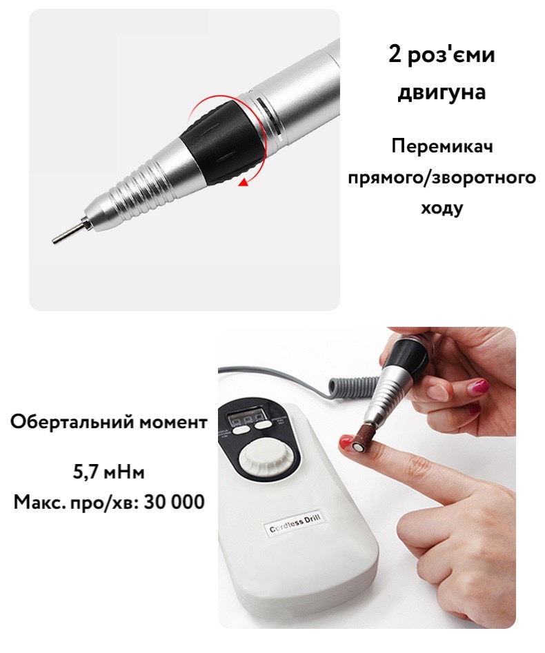 Чудовий апарат для майстрів, що працюють вдома або на виїзді, Потужний акумулятор 2600 mAh без мережі протягом тривалого часу. Чохол на пояс для комфортної процедури – застосовується як тримач фрезера ручки із системним блоком завжди поряд з вами. Матеріал ручки металевий, вага складає 150 грам. Апарат із РК-дисплеєм для контролю швидкості та заряду батареї. Максимальне обертання 30000 оборотів за хвилину, потужність 30 вт, наявність реверсу та відмінне самоохолодження.