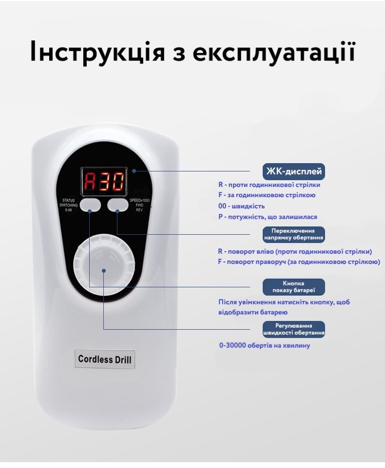 | Функції | Портативний, легкий, зручний для перенесення; дисплей акумулятора (0-99); перемикач прямого/зворотного ходу; індикатор заряду батареї; ВКЛ/ВИКЛ/ручка управління |