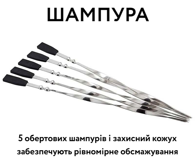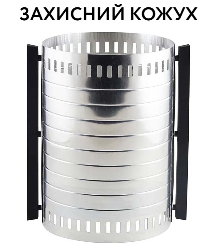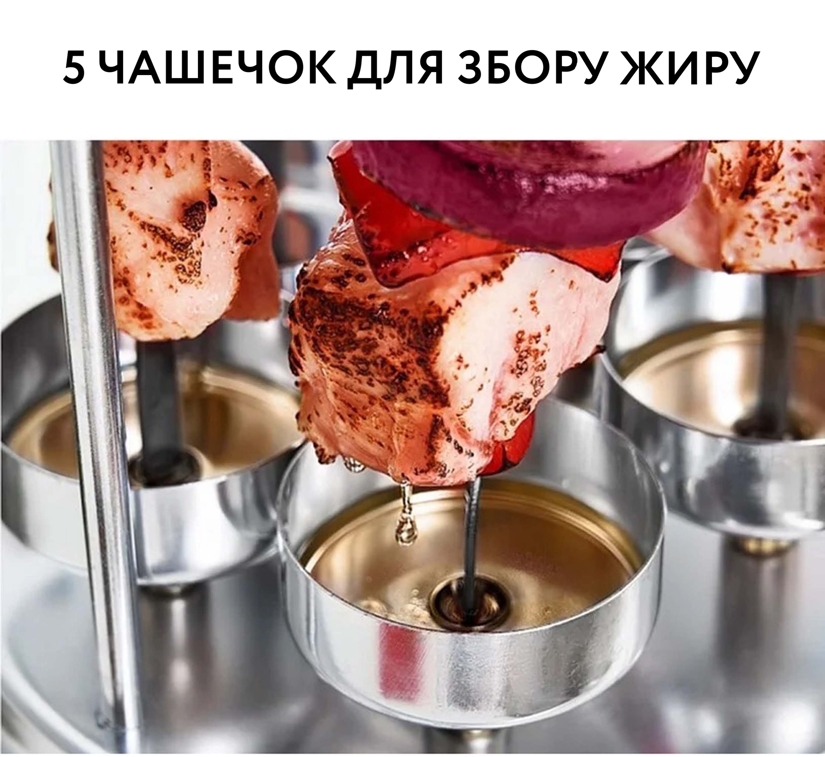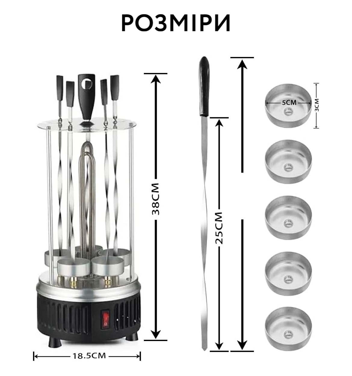 | Комплектація | Електрошашличниця вертикальна, захисний кожух, 5 шампурів, 5 тар для збору жиру, упаковка |