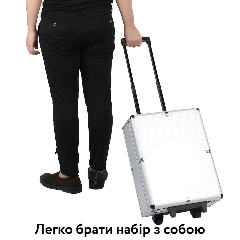 Чотирирівнева валіза передбачає зберігання інструментів у правильному логічному порядку та забезпечує швидкий доступ до деталей, а телескопічна ручка та коліщата на корпусі валізи, дозволять легко та швидко його транспортувати.