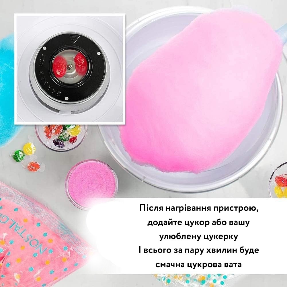 - Апарат для солодкої вати зручний та простий у використанні. З його допомогою вдається швидко приготувати потрібну кількість цукрової вати з мінімумом виробничих витрат.