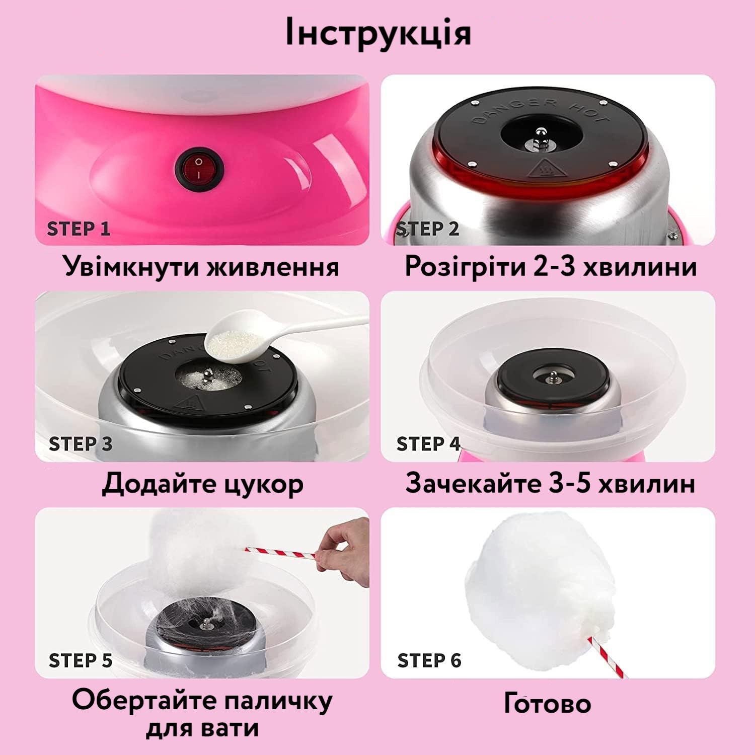 Апарат, який допоможе легко приготувати улюблені з дитинства ласощі - солодку цукрову вату. Для цього просто засипаємо в спеціальний резервуар 1 чайну ложку цукру, потім вмикаємо прилад і чекаємо кілька хвилин, поки він нагріється і з'явиться цукрова павутина. Потім приступаємо до найцікавішого процесу - намотування вати. Приготовлена Вами повітряна цукрова вата в помірній кількості безпечна для здоров'я, оскільки не містить барвників, консервантів та інших шкідливих речовин.