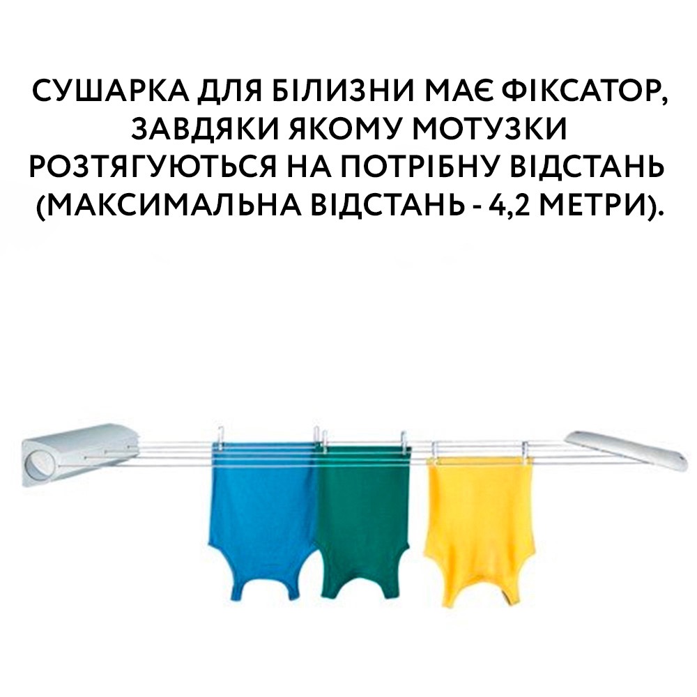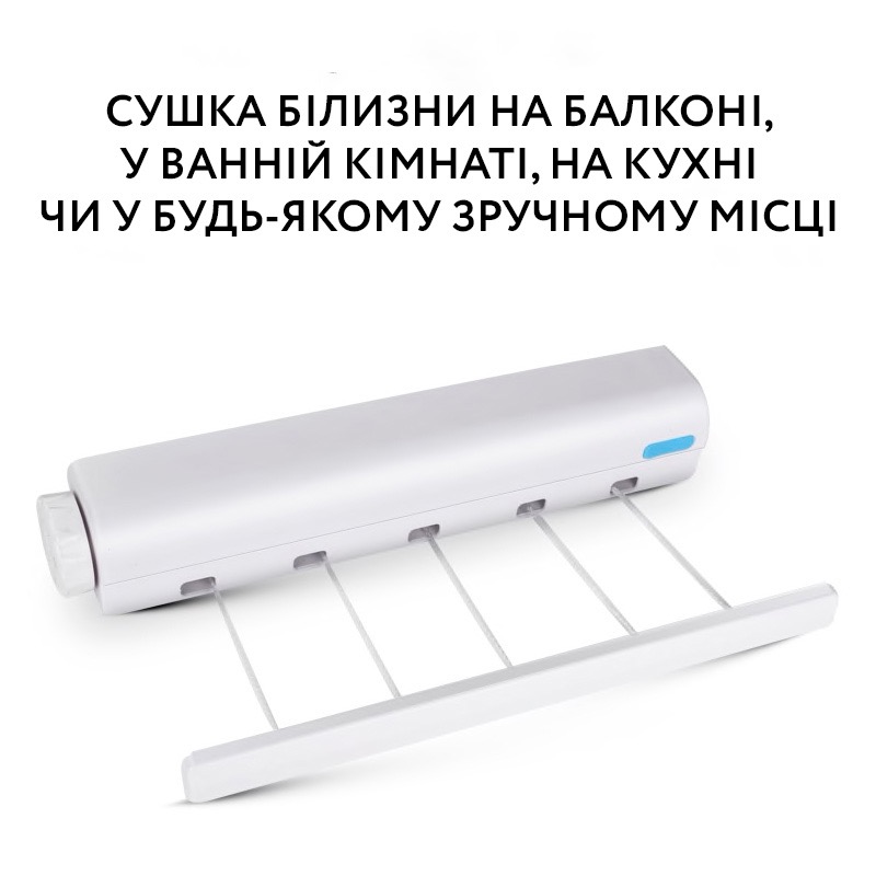 Вішалку для сушіння білизни з автоматичною системою змотування мотузок буде зручно встановити у ванній або на балконі для економії вільного місця. Коли вішалка не використовується за призначенням, ви навіть не помічатимете її.