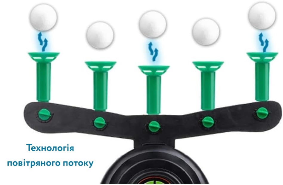 Увімкніть вентилятор і акуратно помістіть одну з кульок з пінопласту над кожною з п'яти вихорів. Як за помахом чарівної палички вони миттєво починають зависати в повітрі.Візьміть пістолет і завантажте в нього один із трез пінних дротиків. Потягніть петлю, цілитеся за допомогою вбудованих прицілів.