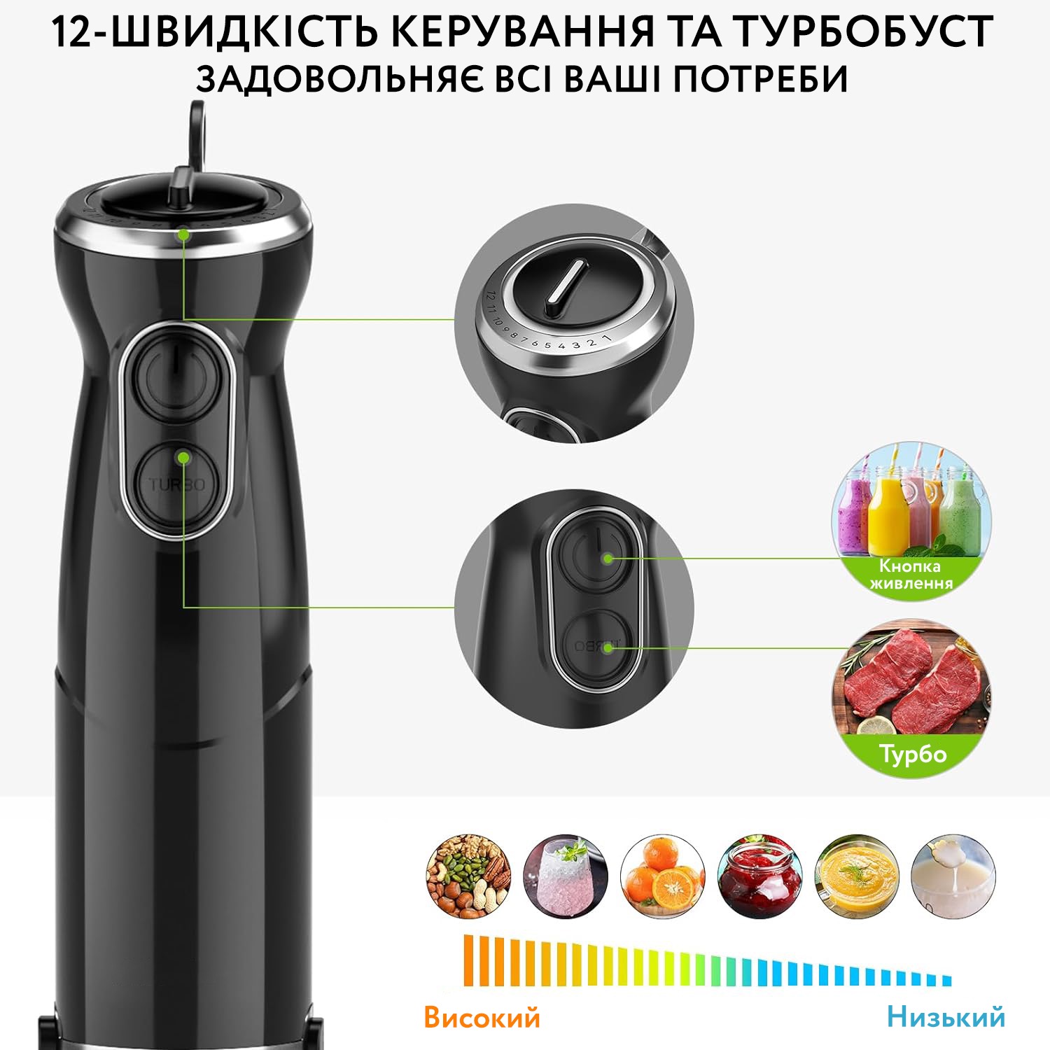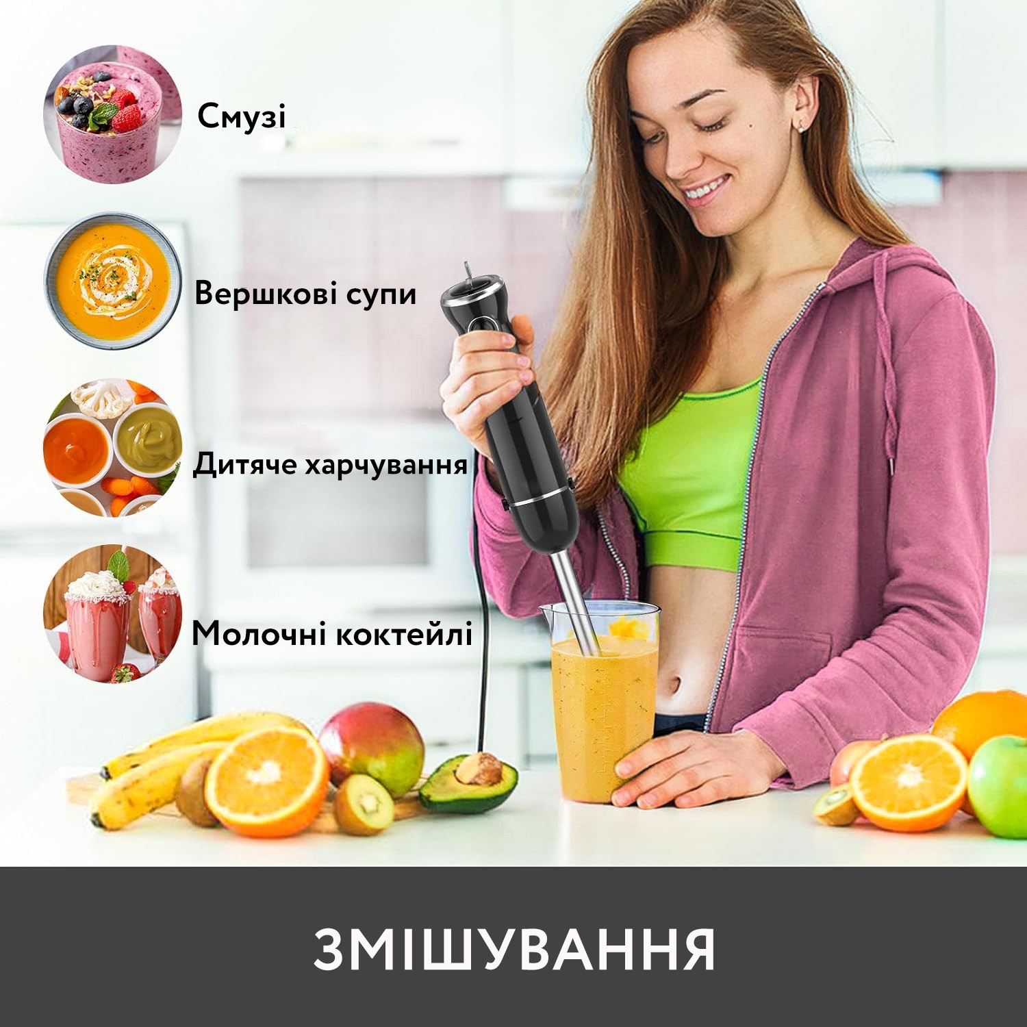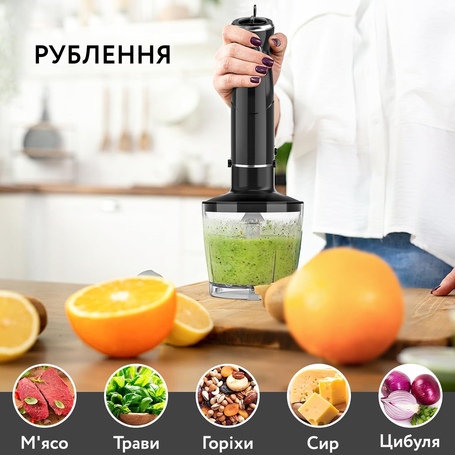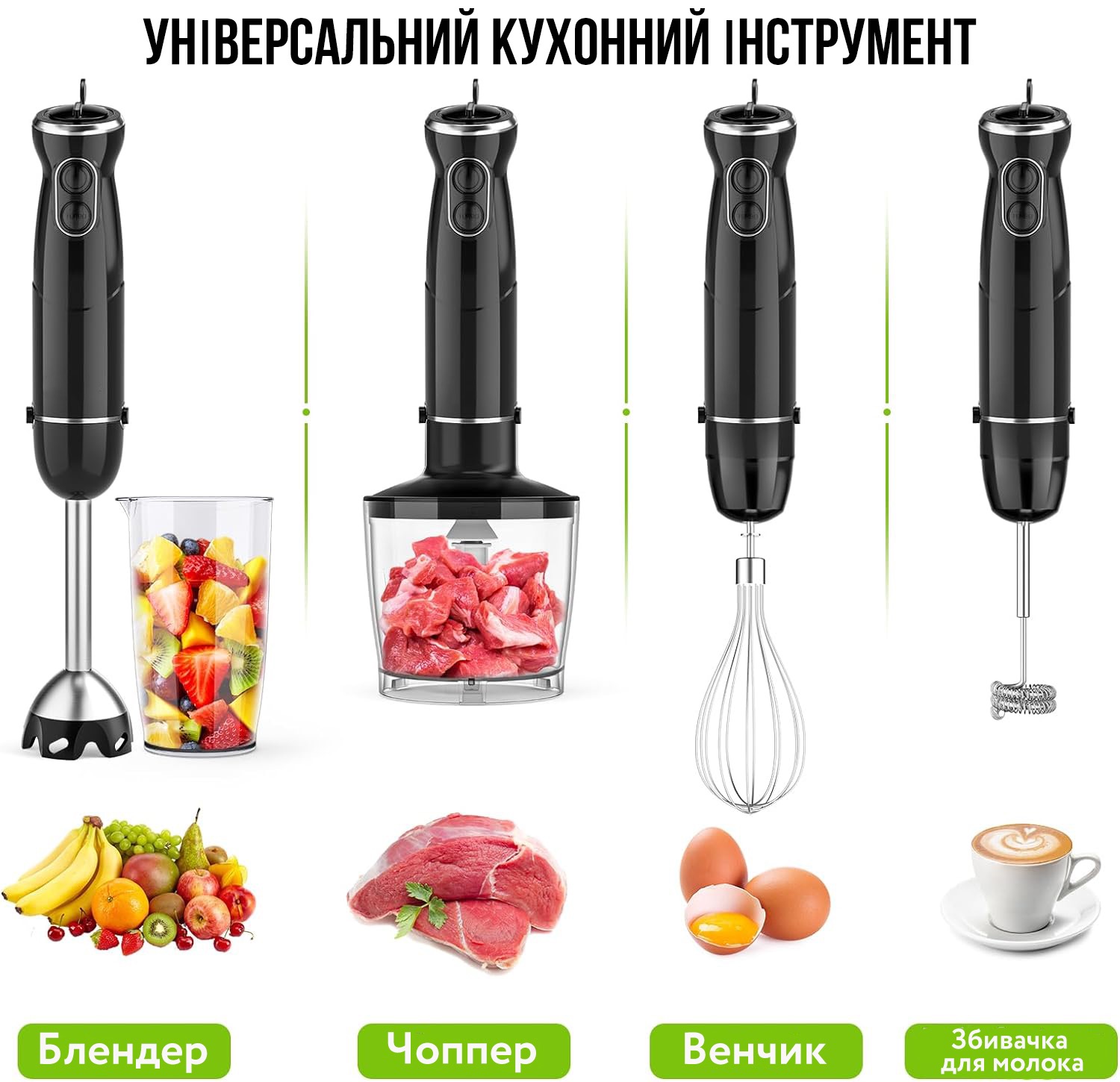 Блендер, подрібнювач, віночок, капучинатор, мірний верстатБлендер ручний - універсальний прилад 5 в 1 для подрібнення і збивання, збивання молочної піни, який має потужний, але тихий мотор потужністю 800 Вт.