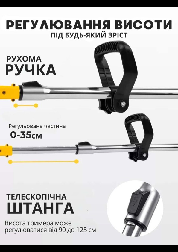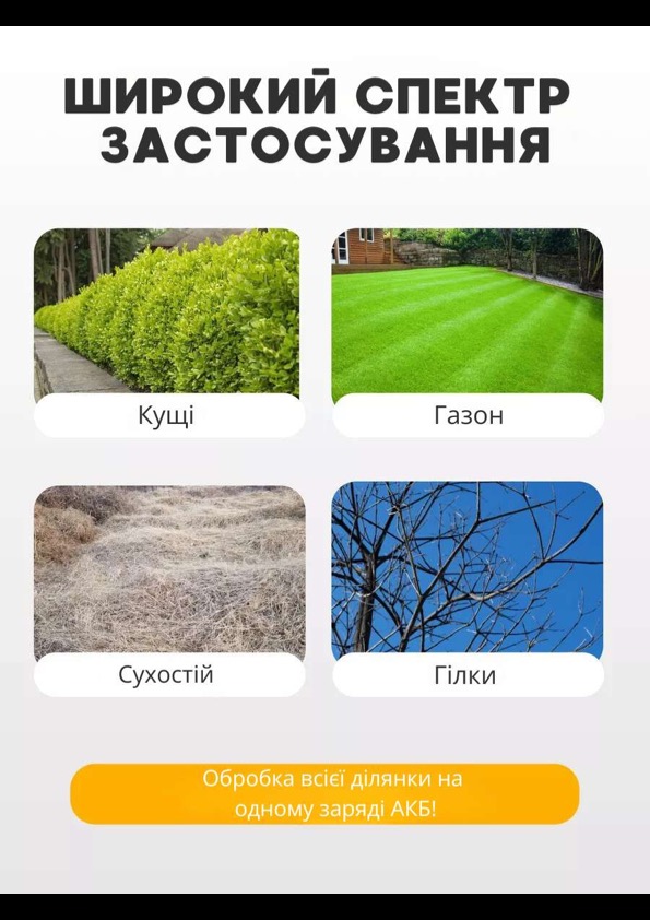 | Дод. опції садового тримера | захист від перевантаження, додаткова рукоятка, легкий запуск, відсутність вихлопу, акумуляторний |
