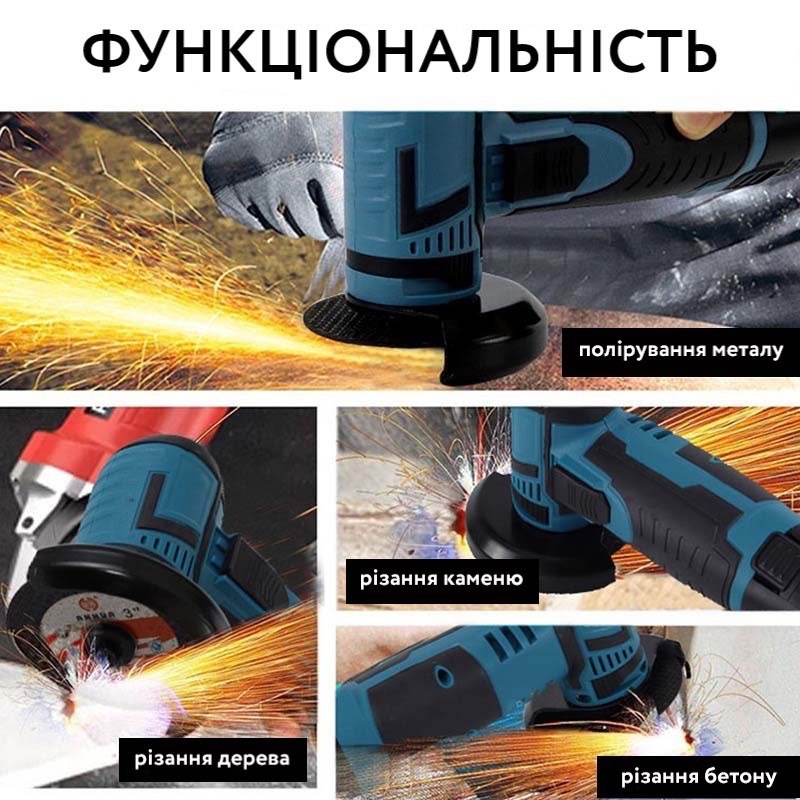 | Комплектація | Акумуляторна кутова шліфмашина (болгарка). 2 акумулятори. Швидкозарядний пристрій. |