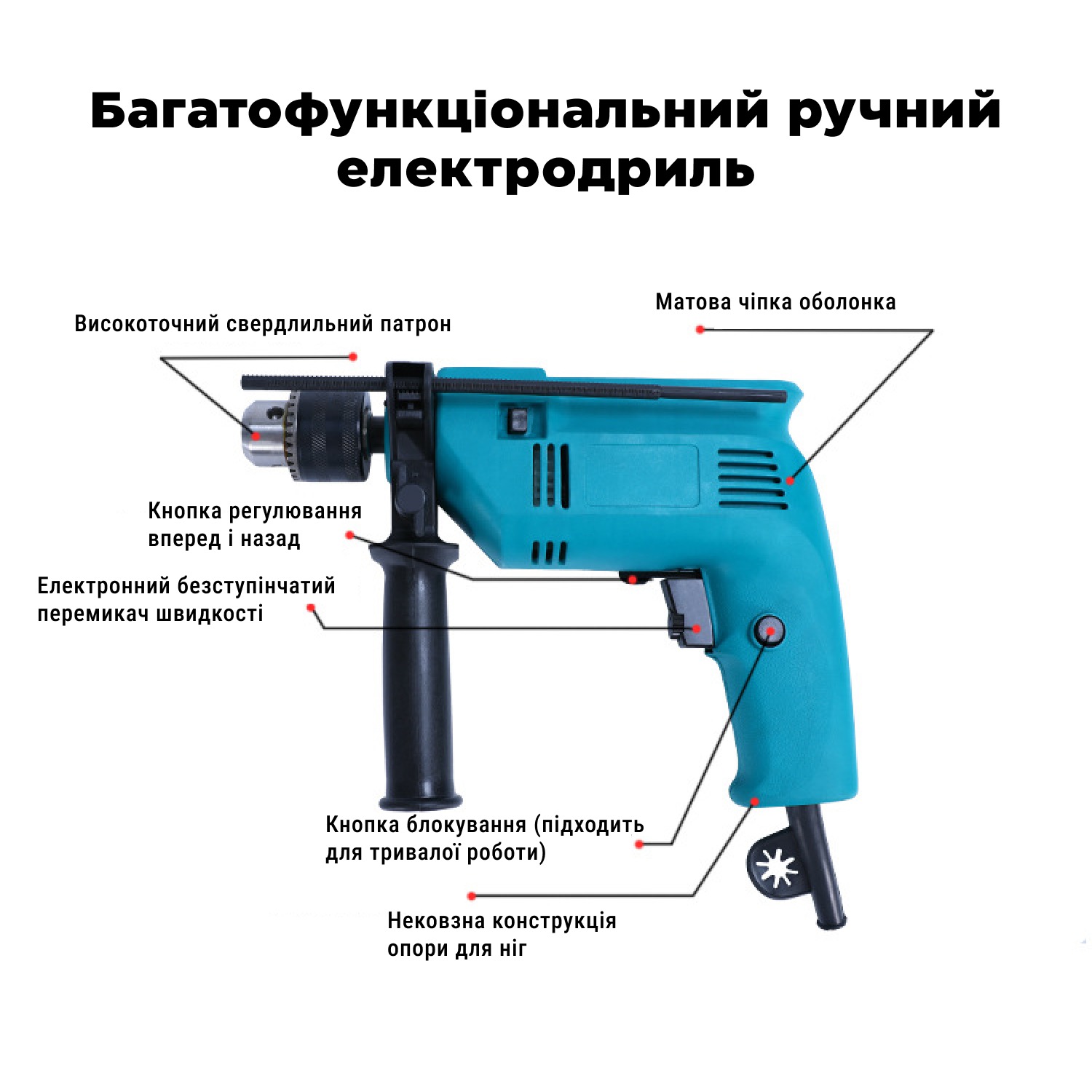Ударний дриль має розширені функціональні можливості, а також патрон, що дає змогу використовувати свердла діаметром від 1,5 до 13 мм. Двигун дриля виготовлений у подвійній ізоляції і має захист від перегріву, а також витримає будь-які тривалі навантаження.