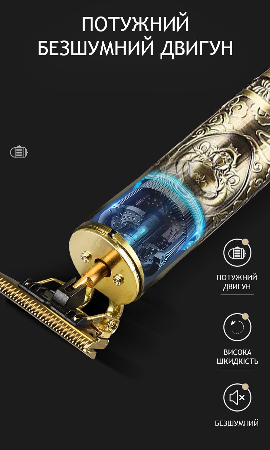Відрізняється міцним алюмінієвим корпусом, стійким до вібрації, низьким рівнем шуму, стильним вінтажним дизайном з гравіюваннями, плавним ходом гострих лез та тривалим терміном служби. Під час роботи пристрій не створює значного шуму. Змінні насадки дозволяють вибрати довжину стрижки від 1 до 3 мм (3 насадки: 1, 2, 3 мм).