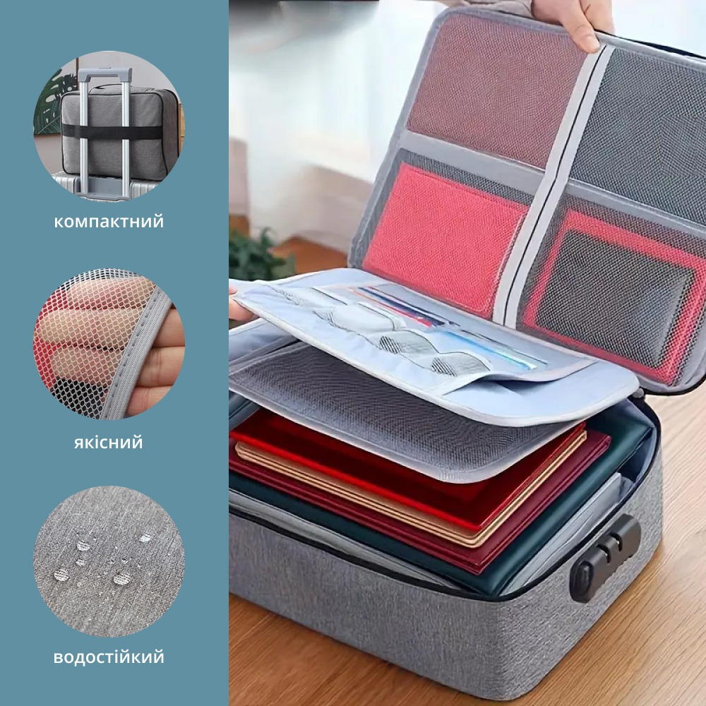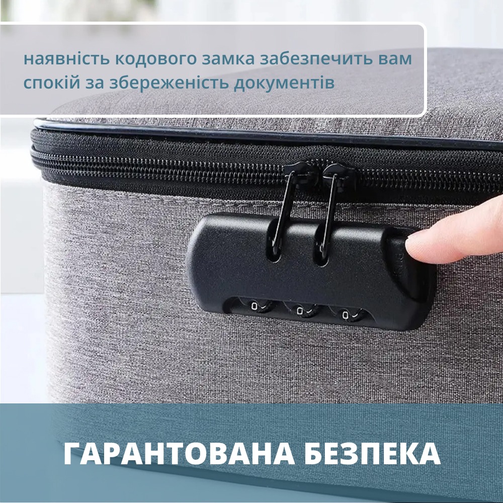 Сумка-органайзер для подорожей з кодовим замком є відмінним варіантом для впорядкування та захисту важливих документів як під час подорожей, так і вдома. Вона водночас компактна та містка - її простору достатньо для організованого зберігання паспортів, квитків, грошей та інших необхідних речей.