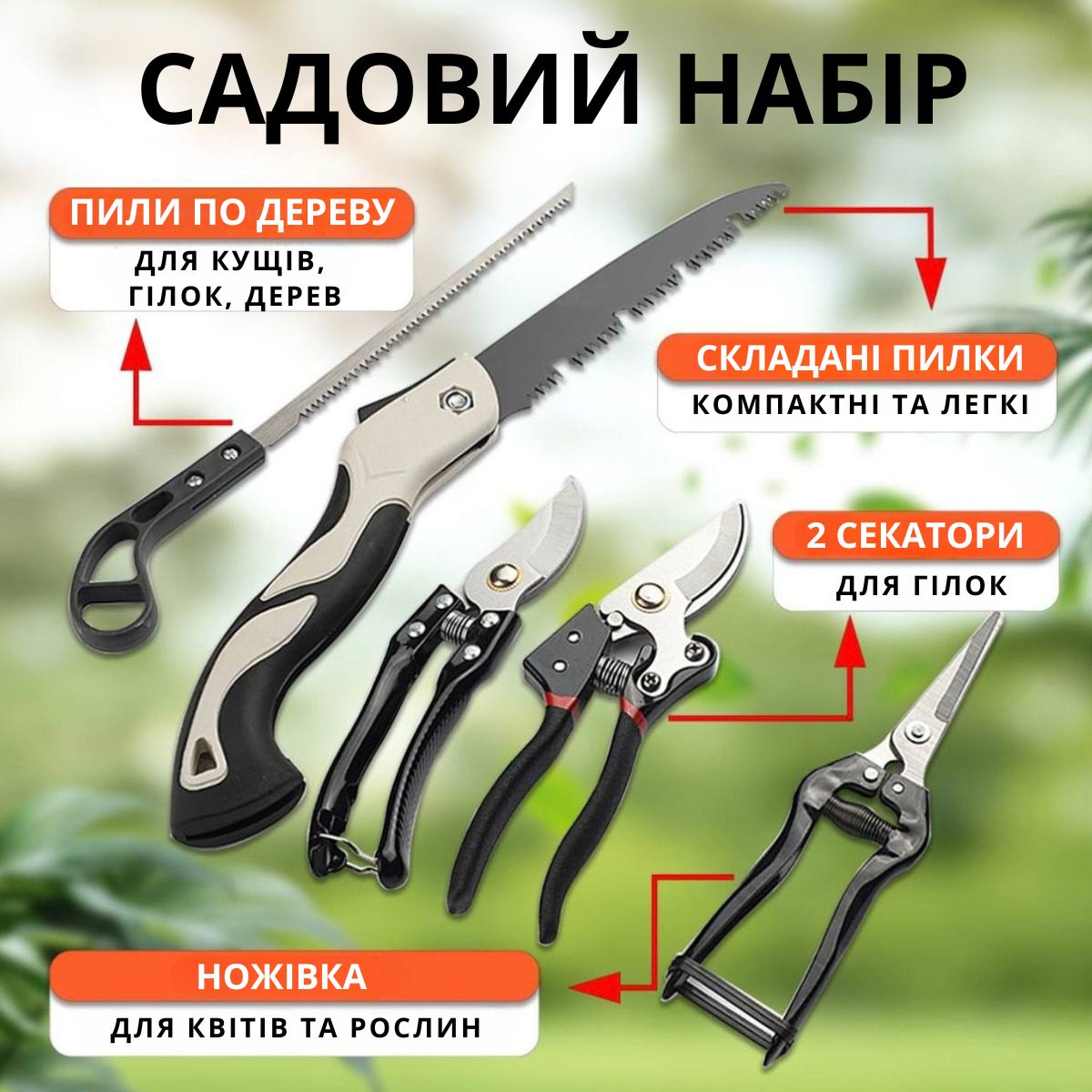 | Комплектація | Секатор (великий), Секатор (малий), Ножиці для квітів, Садова складна пилка, Ножівка |