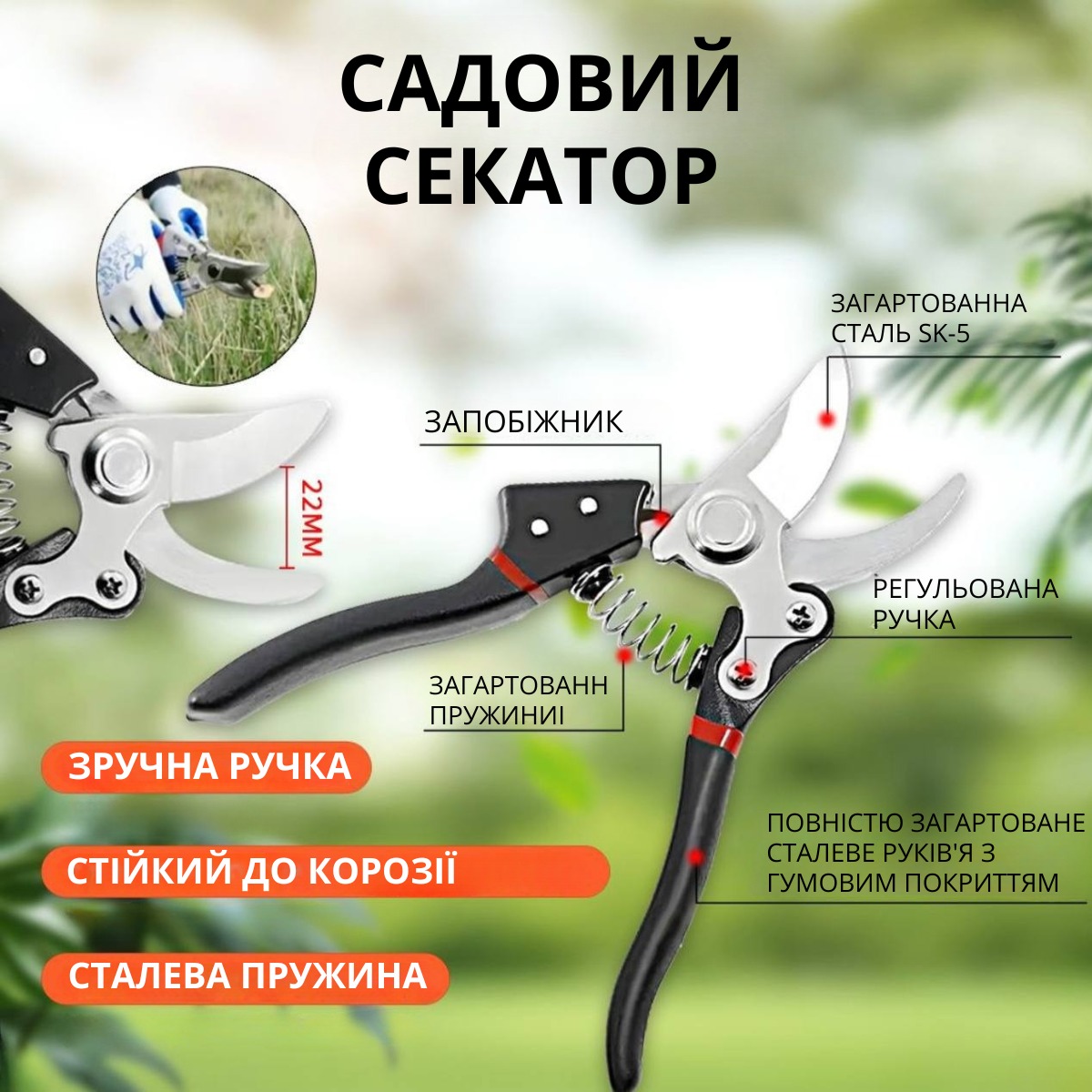 Секатор (малий) – зріз гілок до 20 мм, довжина 21 см.