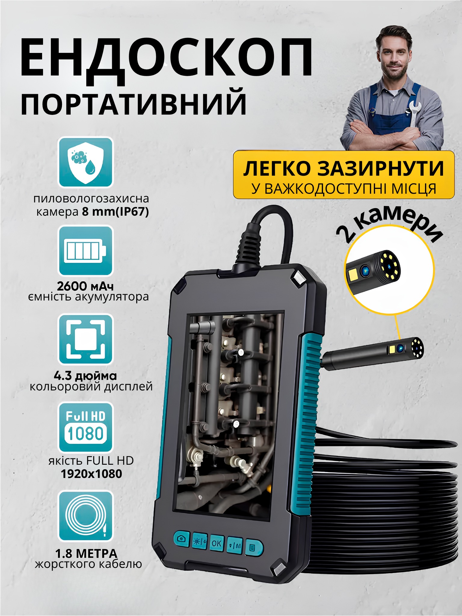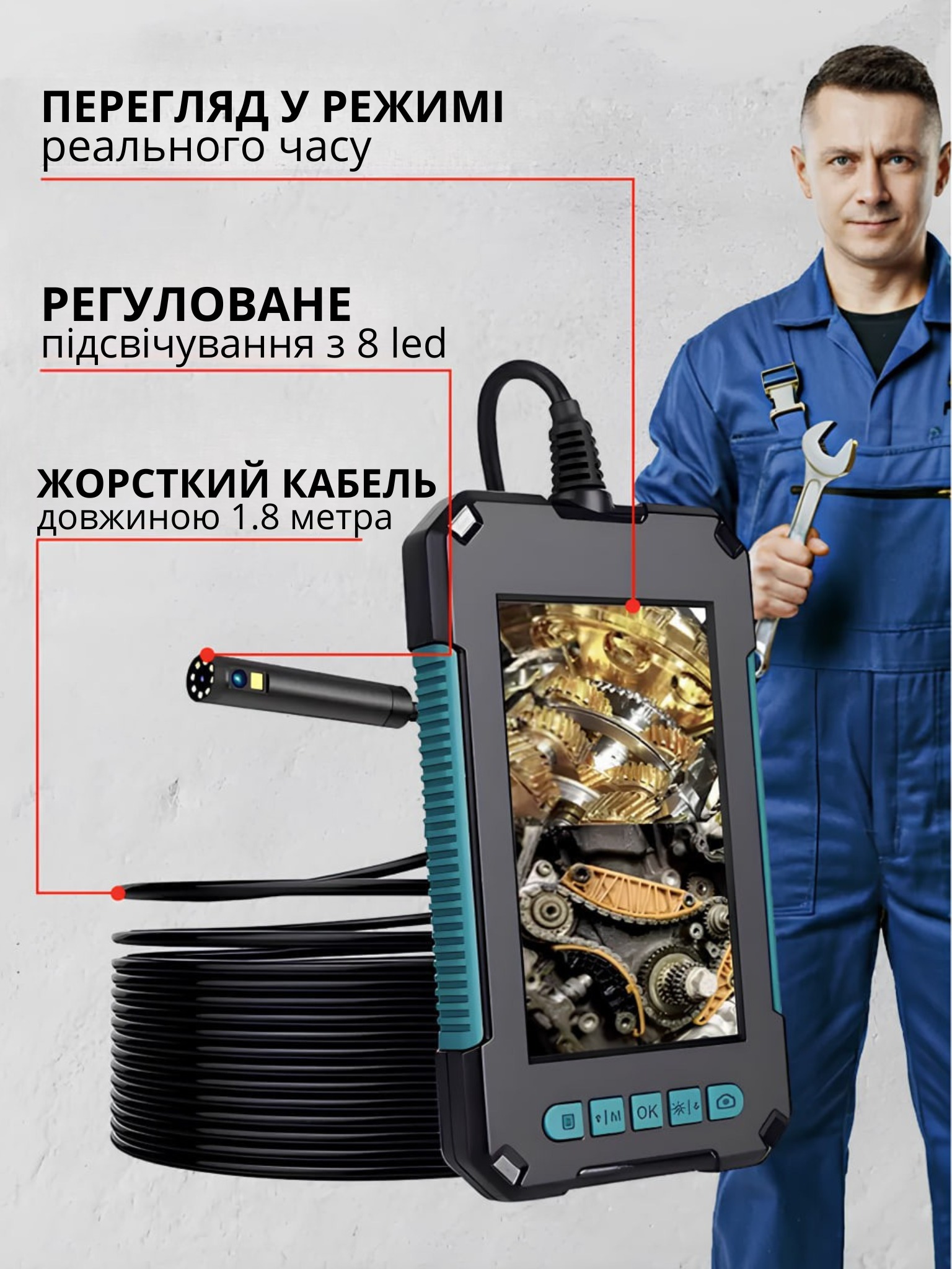 Ендоскоп професійний із РК 4.3 дюйма 5.5мм 1.8м MicroSD IP67 1 камера, P40
